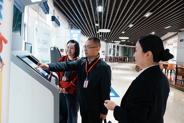 图为赵江(中)在水城区政务服务大厅了解惠民补助资金发放情况。杨俊淇 摄