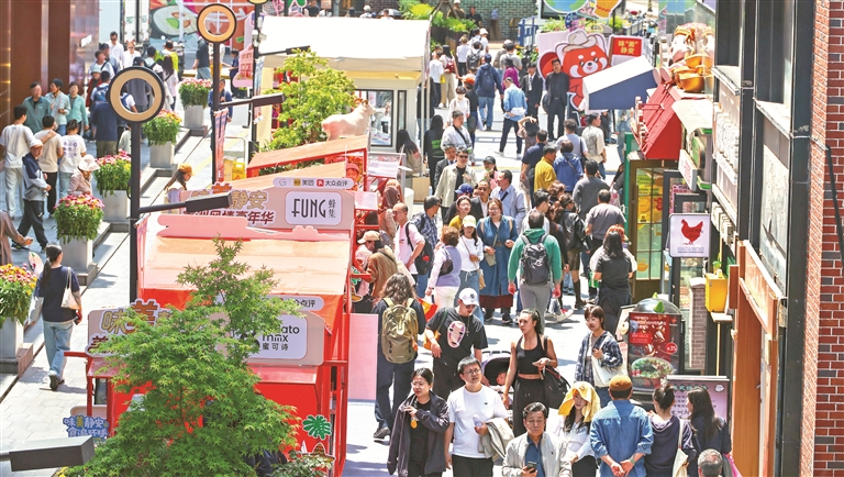 今年以来,各地区各部门深入实施提振消费专项行动,加快培育服务消费新增长点,推动消费市场运行向好。图为上海市静安区吴江路休闲街开放集市烟火气浓郁,市民游客徜徉于此,释放消费新活力。图片来源:视觉中国