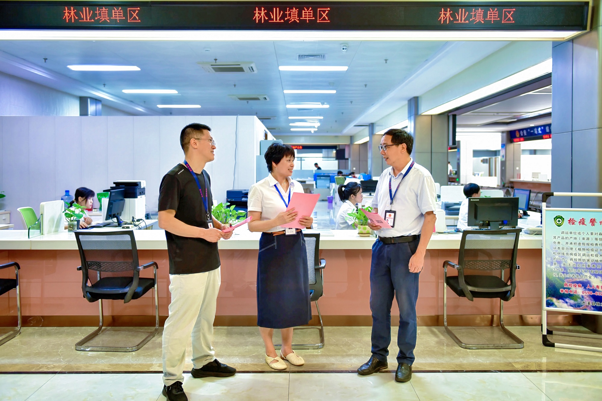 福建省三明市尤溪县纪委监委聚焦林权制度改革关键环节,组织力量下沉一线开展监督,助推林改点“绿”生“金”。图为该县纪检监察干部在政务服务中心林业综合窗口了解有关情况。张霓虹 摄