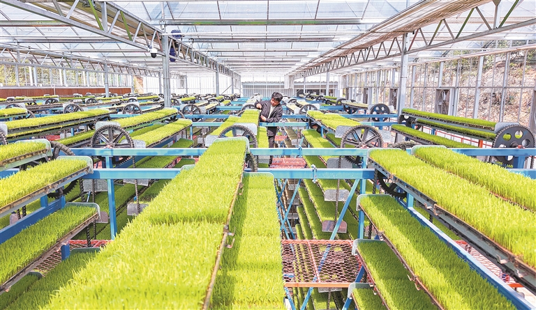 近年来,我国着力发展农业新质生产力,推广农机、创新技术、培育智慧农业,赋能农业高质量发展。图为江西省赣州市赣县区南塘镇的工厂化智慧育秧中心,青年“新农人”正在查看秧苗抽穗情况。 图片来源:视觉中国