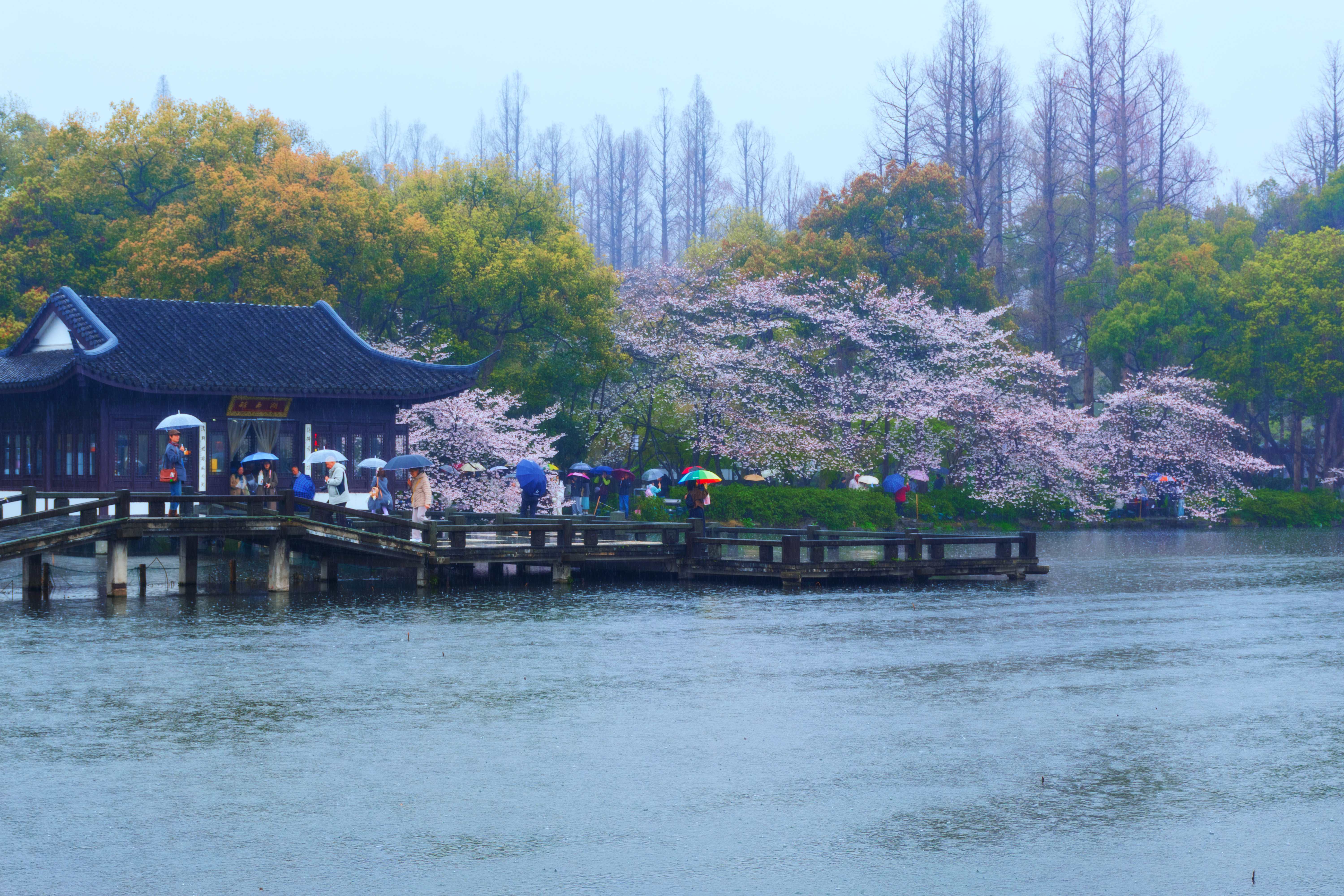 细雨如丝,把西湖的烟水揉成了朦胧的画。曲院风荷的木栈道上,伞花次第绽开,与岸边如云似雪的樱花相映成趣。游人撑着伞,脚步轻缓,在雨幕里欣赏这雨中美景。(杭州市拱墅区纪委监委供 袁豪杰 摄)