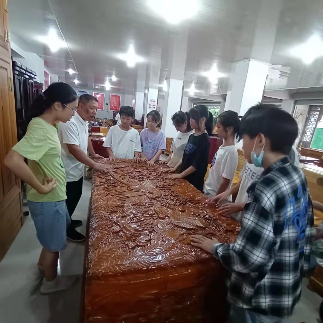 “同学们,看看这各式各样款式的樟木箱,上面的别具一格花纹,是我们师傅们一凿一凿雕刻的……”走进全国劳模、雕刻大师邹财高工作室(店),店内大大小小樟木箱琳琅满目,摆放的整整齐齐。邹财高说:“这些大部分是样品不是卖货,是让你们看得见、摸得着传统工艺的价值,每一件作品,彰显余江木雕的历史,让千年非遗焕发新生机。”