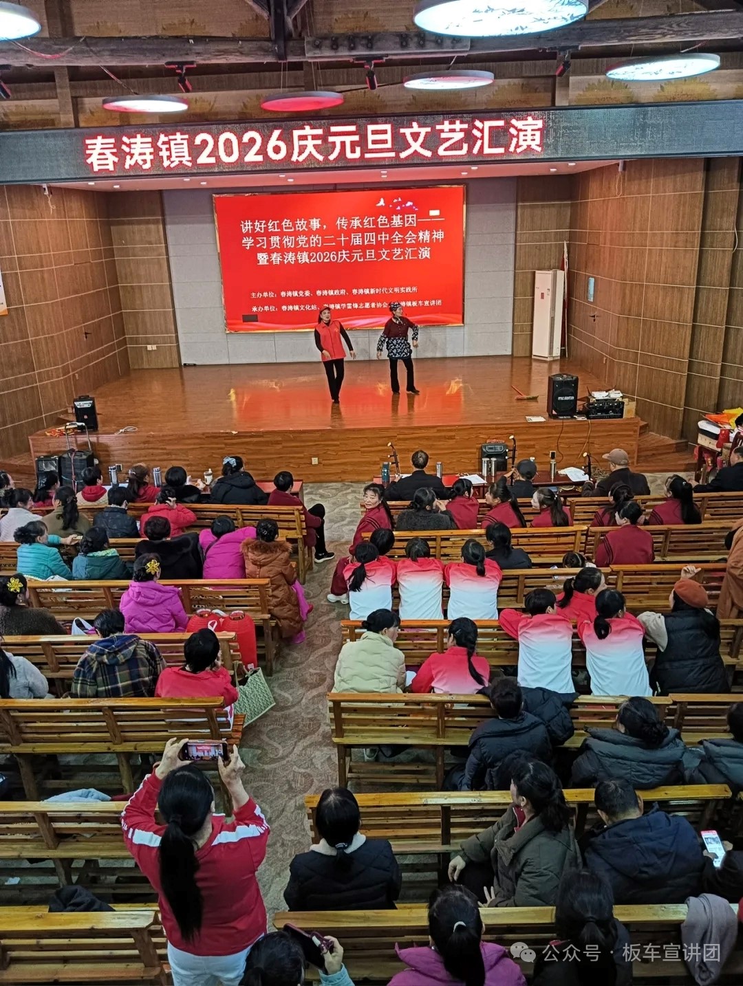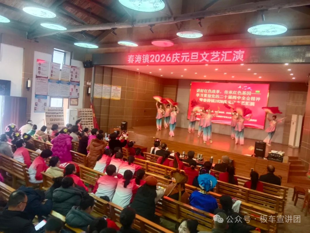2025年12月31日下午一点起,由江西省鹰潭市余江区春涛镇党委、春涛镇人民政府、新时代文明实践所主办,由春涛镇文化站、春涛镇学雷锋志愿者协会、春涛镇板车宣讲团承办的:讲好红色故事丶传承红色基因一一学习贯彻党的二十届四中全会精神暨春涛镇2026庆元旦文艺汇演,在灯火阑珊、金碧辉煌的春涛文化大礼堂拉开序幕。