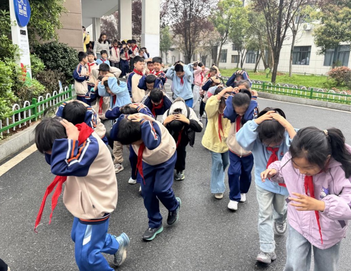 师生抵达操场安全集结区域后,保持防护姿势,各班班主任迅速清点人数并逐级上报,整个演练流程紧凑、高效、有序。