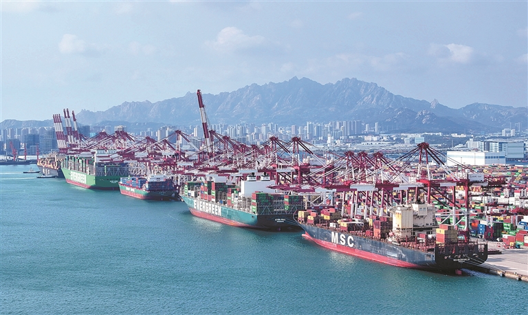 近年来,山东港口青岛港依托毗邻日韩的区位优势及海上贸易往来的枢纽优势,密织覆盖日韩主要港口的海运航线网络。目前,青岛港除承接大量日韩国际中转业务外,每周还有约40班“日韩快线”直达班船,形成了高效、密集、便捷的中日韩海上物流大通道。图为繁忙的青岛港前湾港区。 新华社记者 李紫恒 摄