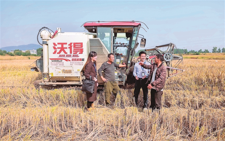 粮食安全是“国之大者”。安徽省含山县纪委监委聚焦高标准农田建设管理中的突出问题开展一线走访,推动“粮田”变“良田”。图为该县纪检监察干部在环峰镇城北村水稻收割现场了解相关情况。欧宗涛 摄