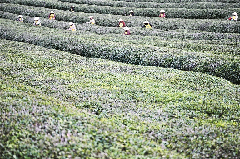 气候条件和悠久历史孕育了特有的茶树品种和制茶技艺,以及深厚的文化内涵。图为福鼎市一家茶企工人在茶园采茶。(资料图片)