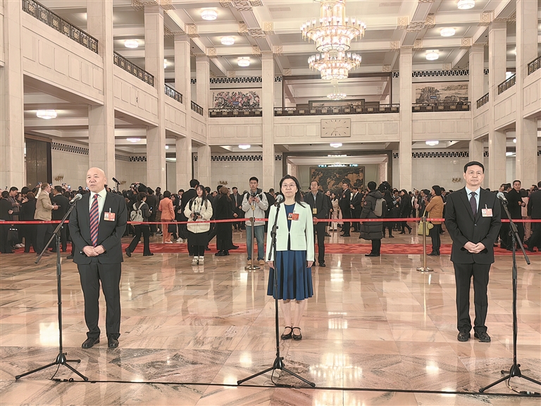 3月4日下午,全国政协十四届四次会议第一场“委员通道”在人民大会堂举行。图为全国政协委员杨杰(右一)、李颖、王勇峰(左一)接受媒体采访。韩思宁 摄