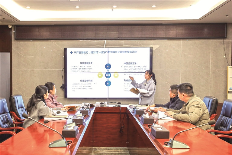江西省宁都县纪委监委聚焦监督重点,压实责任,细化措施,探索强化对“一把手”和领导班子监督的有效举措和办法,着力破解“一把手”监督难题。图为该县纪检监察干部围绕加强对“一把手”监督开展会商研讨。陈育文 摄