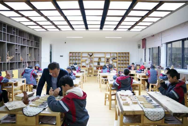 余江区第六中学将雕刻文化引领师生高位发屋,以“爱岗敬业,精益求精”因势象形,让师生在潜移默化中感受文化滋养,构建了独具特色的美术校本课程体系。鉴于雕刻的基础在于绘图,学校根据不同年级学生的认知水平和能力,精心设计了循序渐进的课程内容。一、二年级开设简笔画课程,帮助学生初步培养对图形的认知和绘画基础;三、四年级开展线条造型课程,进一步提升学生的构图和表现能力;五、六年级则进行素描教学,为学生打下扎实的美术功底;七、八、九年级成立雕刻社团,并聘请全国雕刻大师宋志勇亲自任教。宋志勇大师凭借其深厚的雕刻造诣和丰富的实践经验,为学生们带来专业且生动的雕刻课程,让学生们能够近距离感受雕刻艺术的魅力,学习精湛的雕刻技艺。这种系统化、阶梯式的课程设置,不仅激发了学生对美术和雕刻的兴趣,更为他们深入了解和传承雕刻文化奠定了坚实基础。