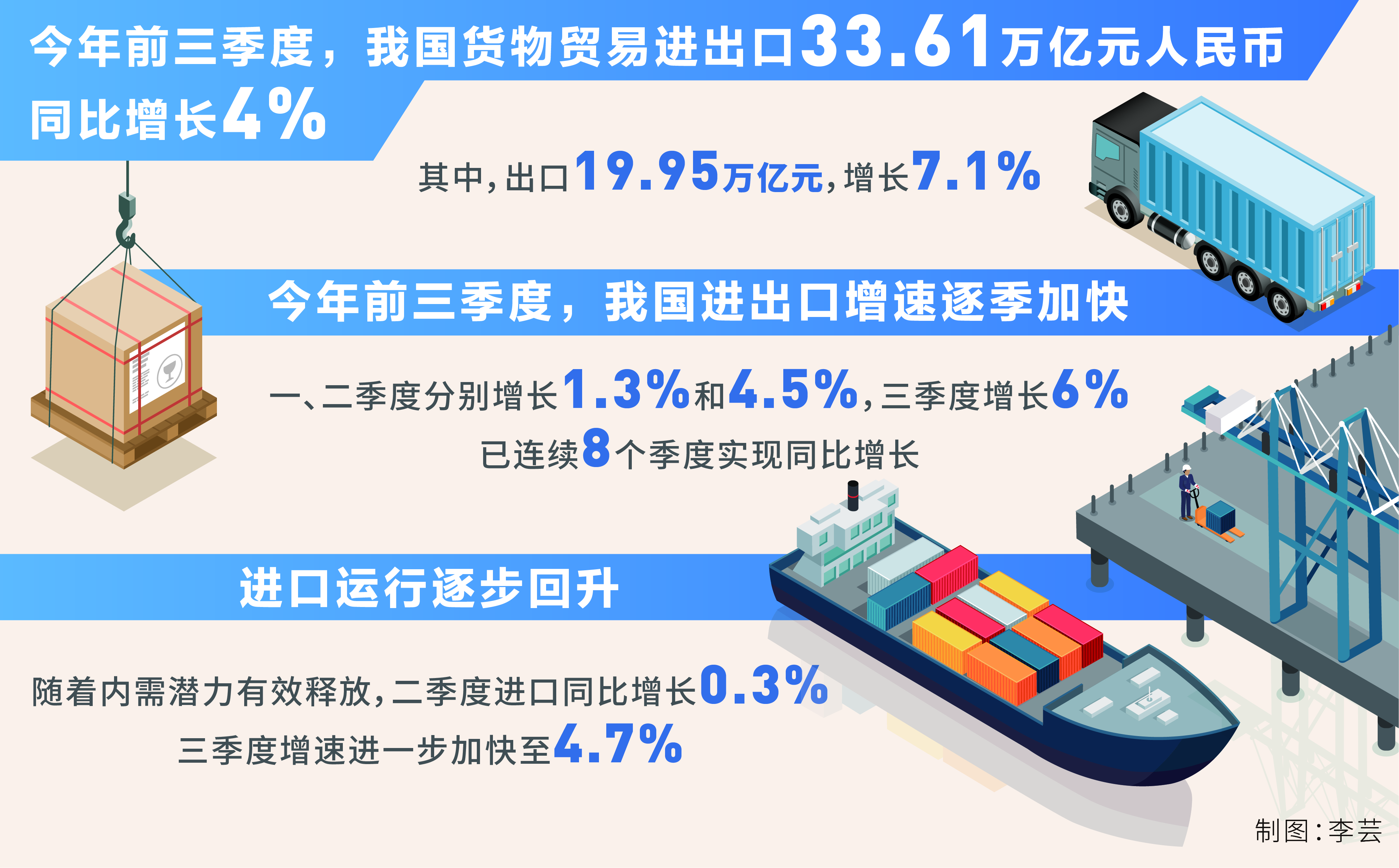 前三季度我国货物贸易进出口同比增长4% 连续8个季度实现同比增长