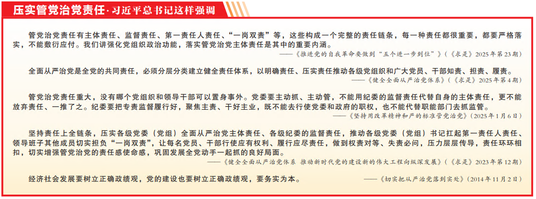 作为监督专责机关,我们坚持履行好监督责任,督促各级党组织扛牢主体责任,各级党组织书记扛起第一责任人责任、领导班子其他成员切实担负“一岗双责”,坚决摒弃重显绩轻潜绩、重发展轻监管的政绩观偏差,将责任落实贯穿抓党建和管业务全过程,厘清领导班子、主要负责人、分管领导的责任边界,做到权责清晰。聚焦责任落实薄弱环节,强化监督执纪问责,紧盯责任空转、履职不力、推诿扯皮等问题,精准纠治形式主义、官僚主义,对因责任落实不到位造成重大影响、损害群众利益的,从严追责问责。同时,健全责任落实闭环管理机制,做深做细日常监督,以有力有效监督推动各级各部门守土有责、守土负责、守土尽责,切实把正确政绩观体现到担当履职、务实干事的实际行动上。