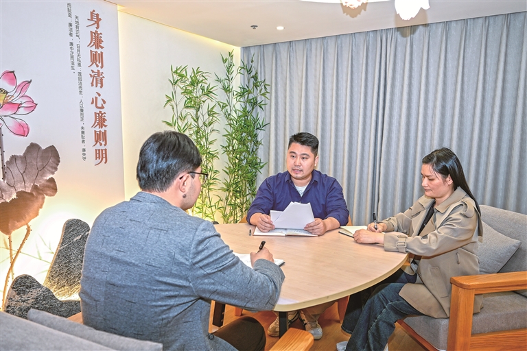 广西壮族自治区鹿寨县纪委监委聚焦管党治党责任落实中存在的苗头性倾向性问题,常态化开展谈话提醒,督促党员领导干部牢固树立和践行正确政绩观,切实扛牢管党治党责任,以务实作风履职尽责,确保各项部署要求落地见效。图为该县纪委监委干部与相关单位负责同志开展专题谈心谈话。周帮玲 摄