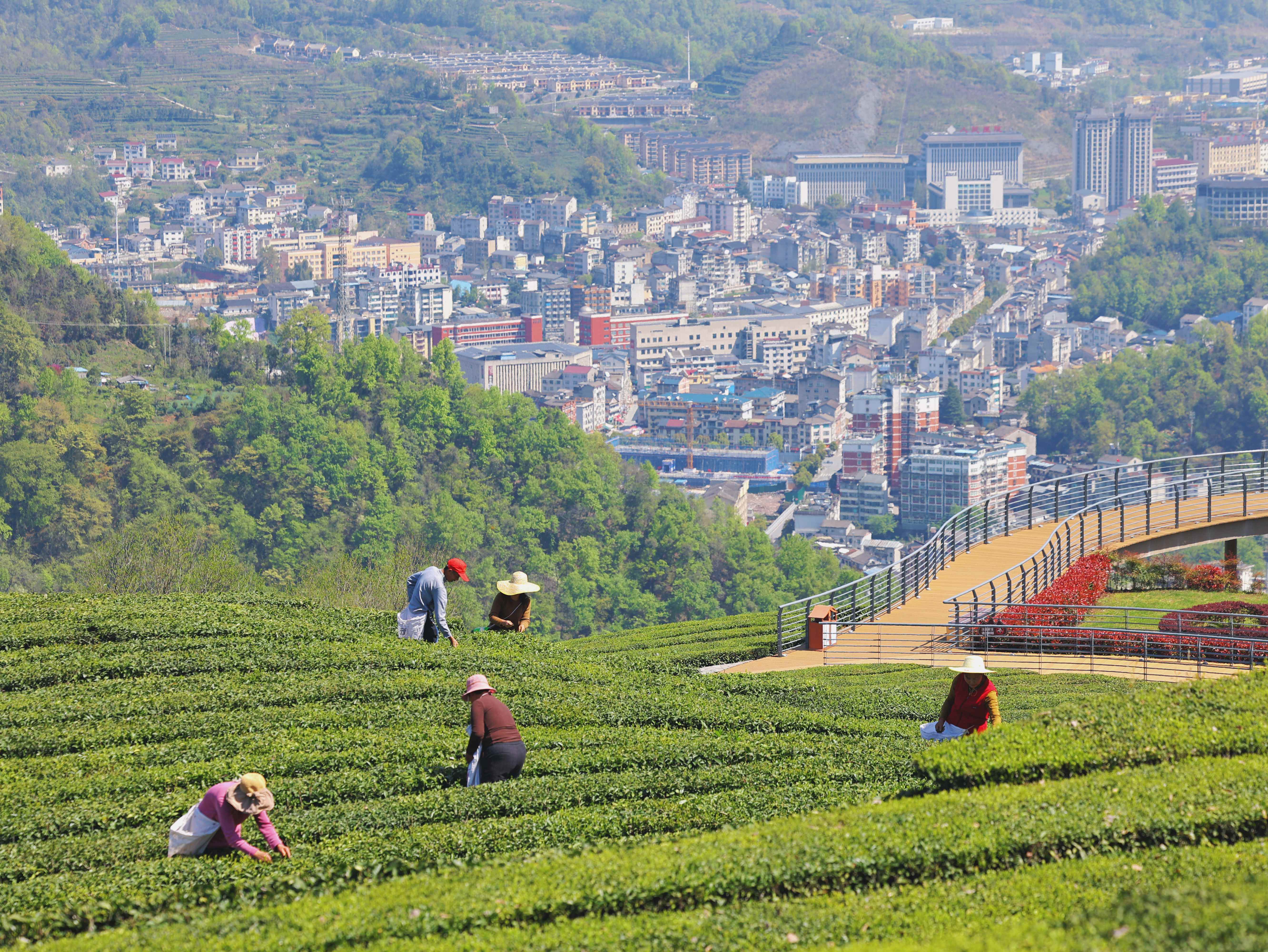 清明时节,五峰茶山如翠浪翻涌。茶农们抢抓春光,指尖在茶垄间灵巧翻飞,口袋渐盈,与茶山脚下的青绿山城共绘一幅春日秀美画卷。(湖北省五峰土家族自治县纪委监委供 李莫 摄)