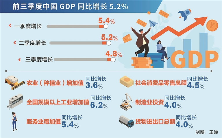 分季度看,一季度GDP同比增长5.4%,二季度增长5.2%,三季度增长4.8%。