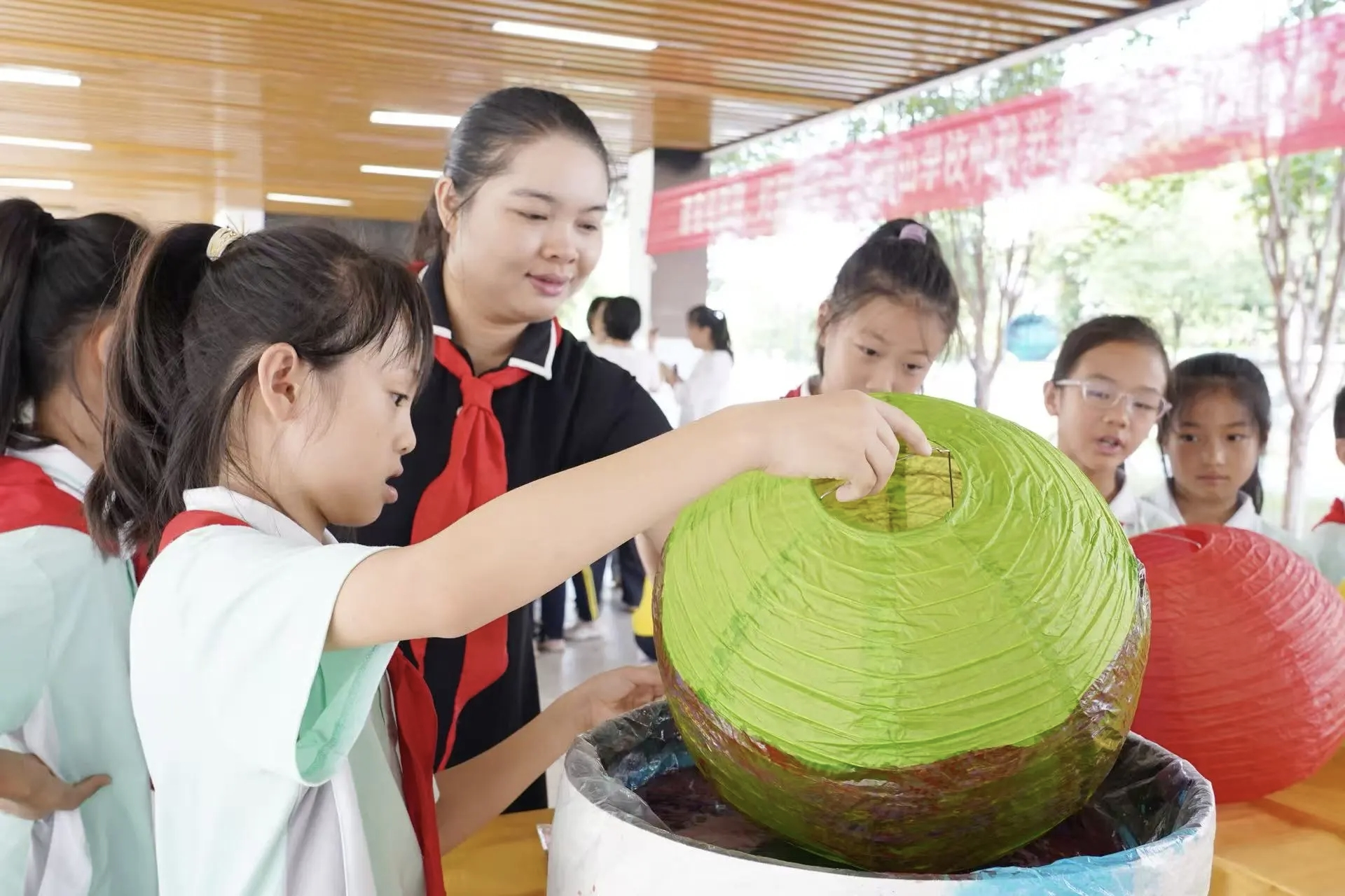 为锻炼孩子们的艺术感知力与对传统文化的探索能力,老师带领同学们化身为小小艺术家,当彩色的灯笼与绚丽的水面轻轻接触,一幅幅充满偶然性与艺术感的漆画便跃然其上。