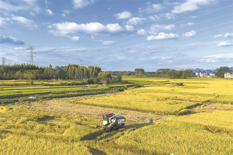 10月,在广西壮族自治区桂林市兴安县,“稻海翻金浪”的丰收画面美不胜收。田埂上,兴安县全新农机专业合作社负责人唐新全捻起一粒刚脱粒的稻谷:“今年水稻亩产预计达到1100多斤,产量较往年有增长。稻子能有这么好的品相和产量,真不容易!”